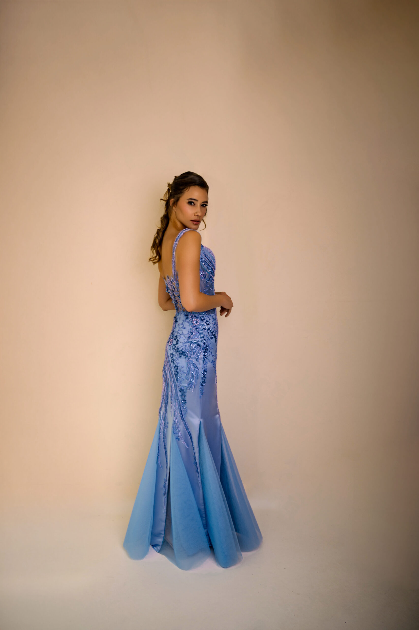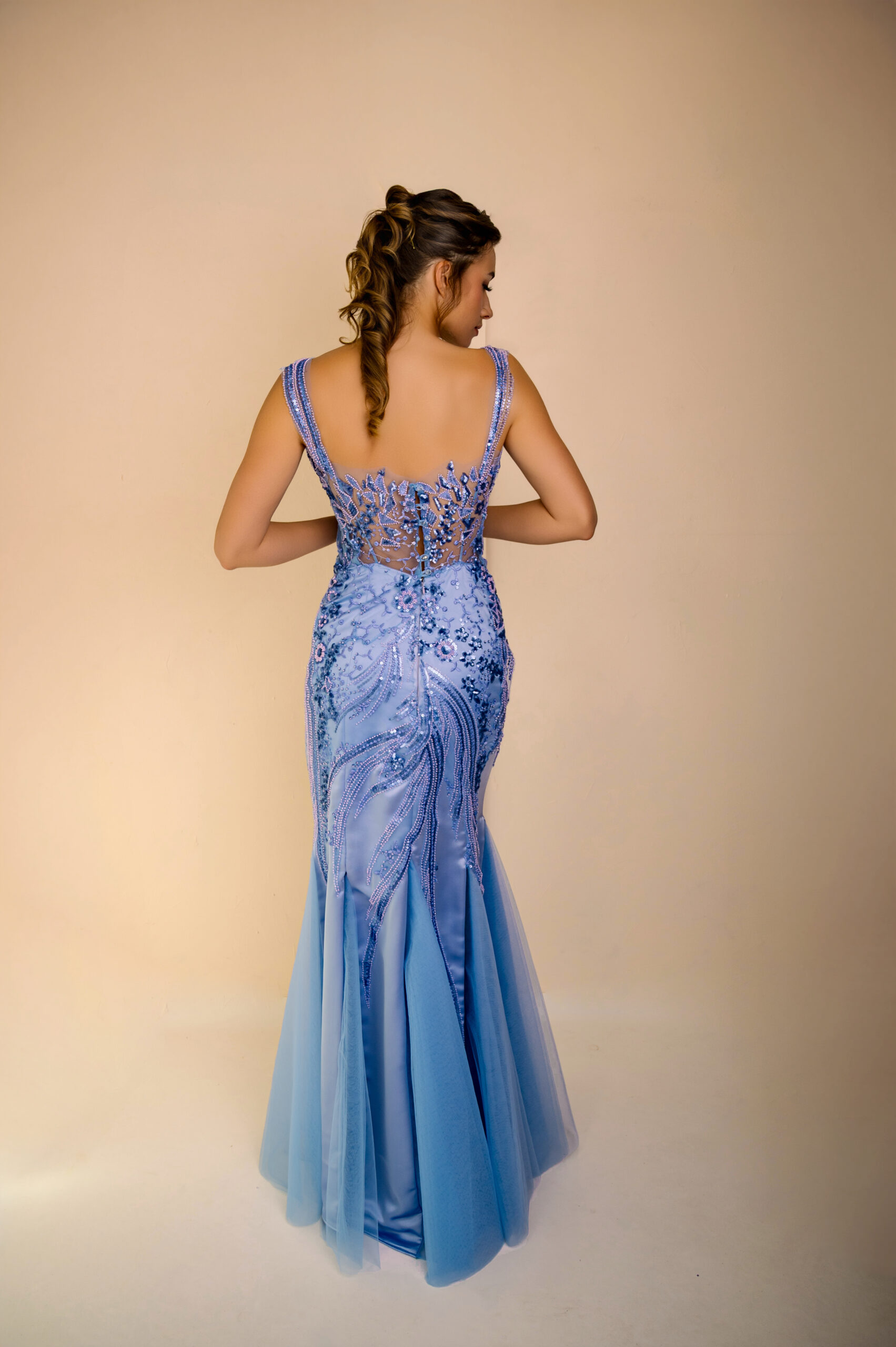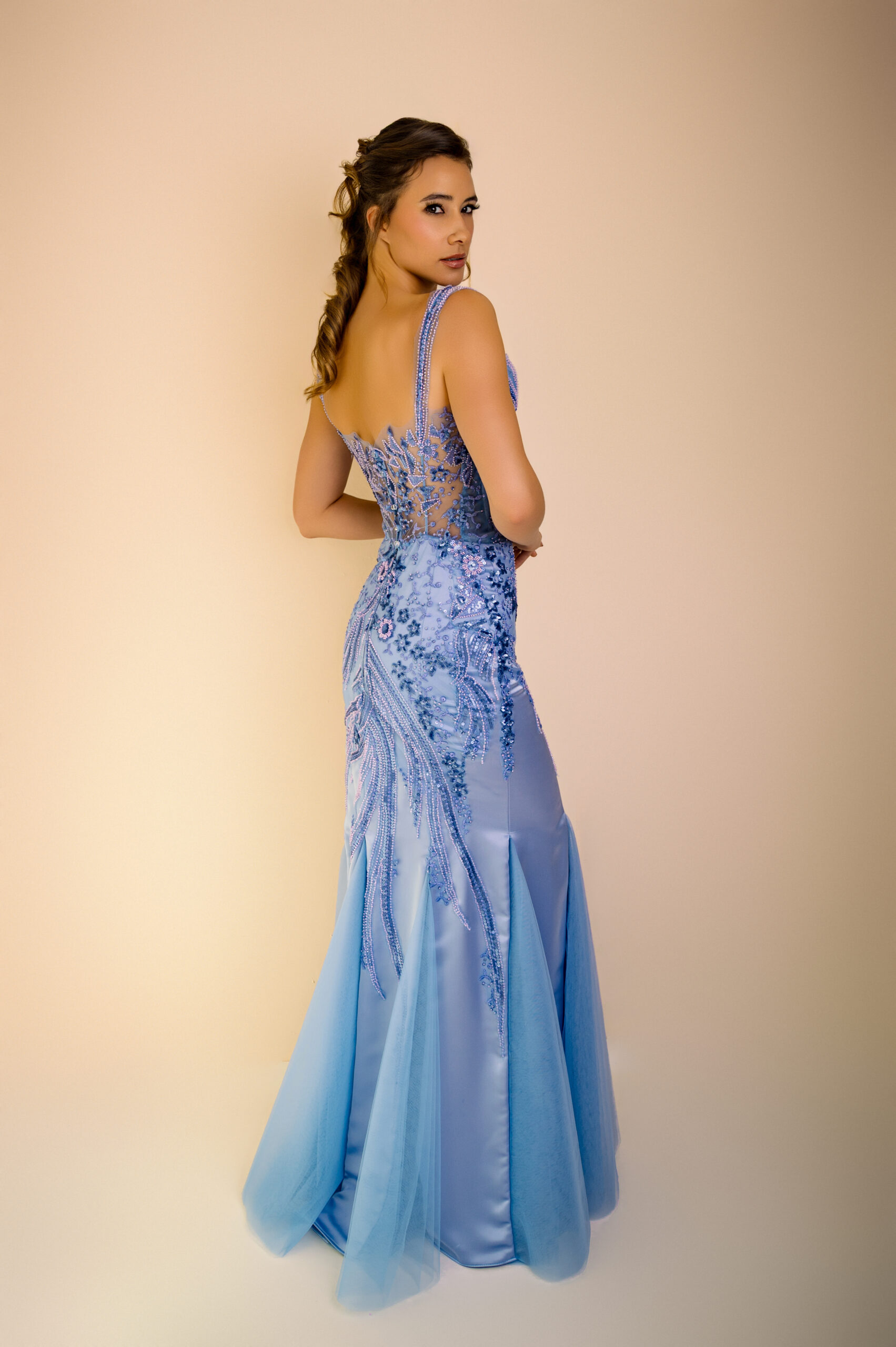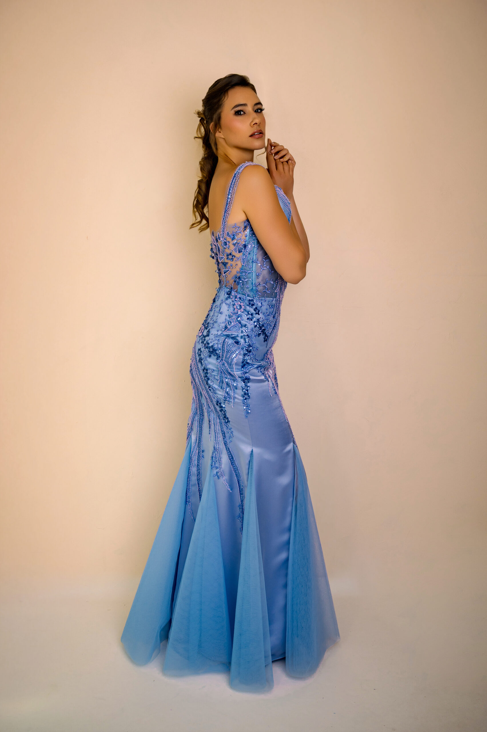 DETALLES: Modelo asignado con godets, corset escote corazón con tul de pedrería.