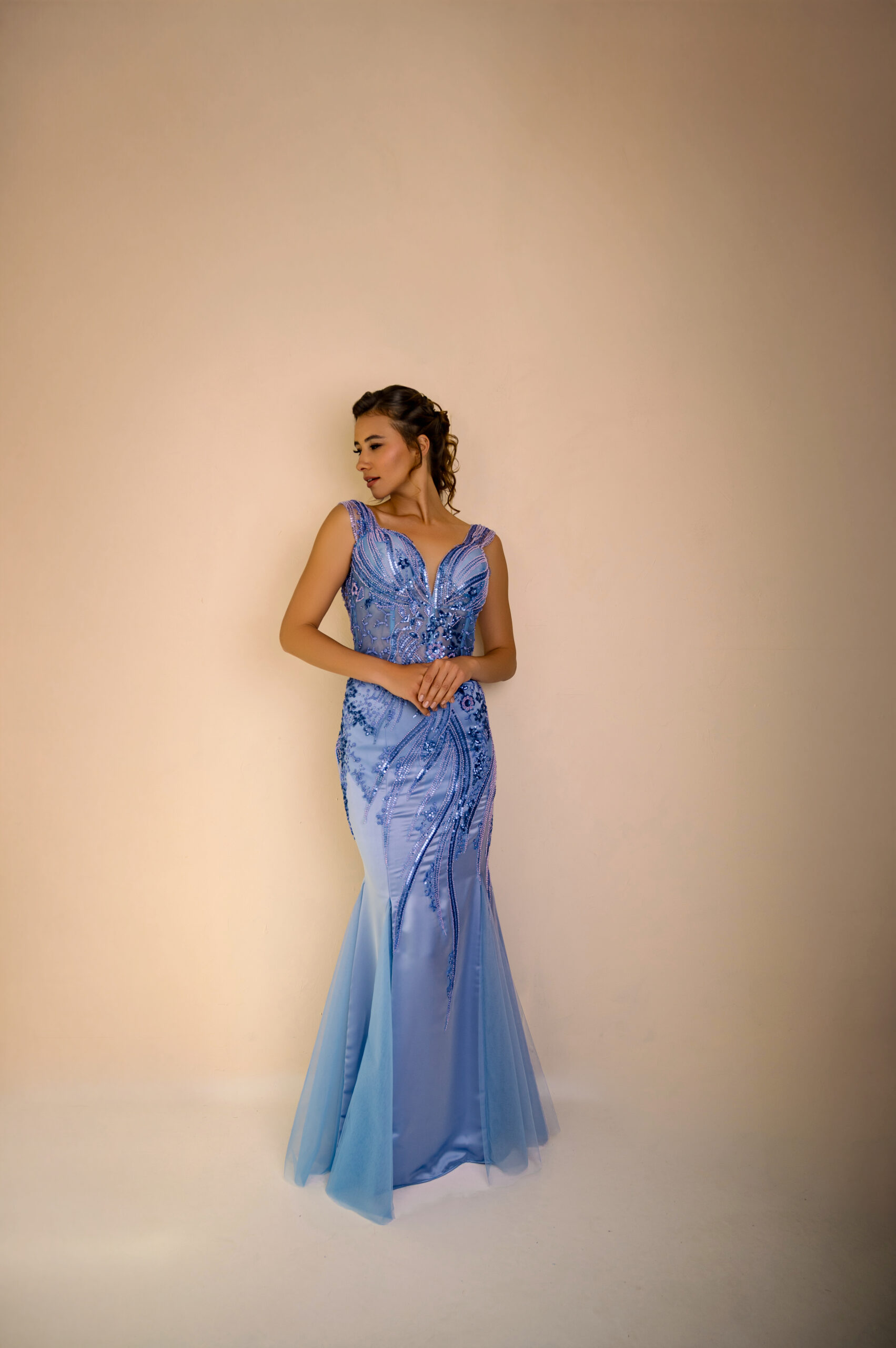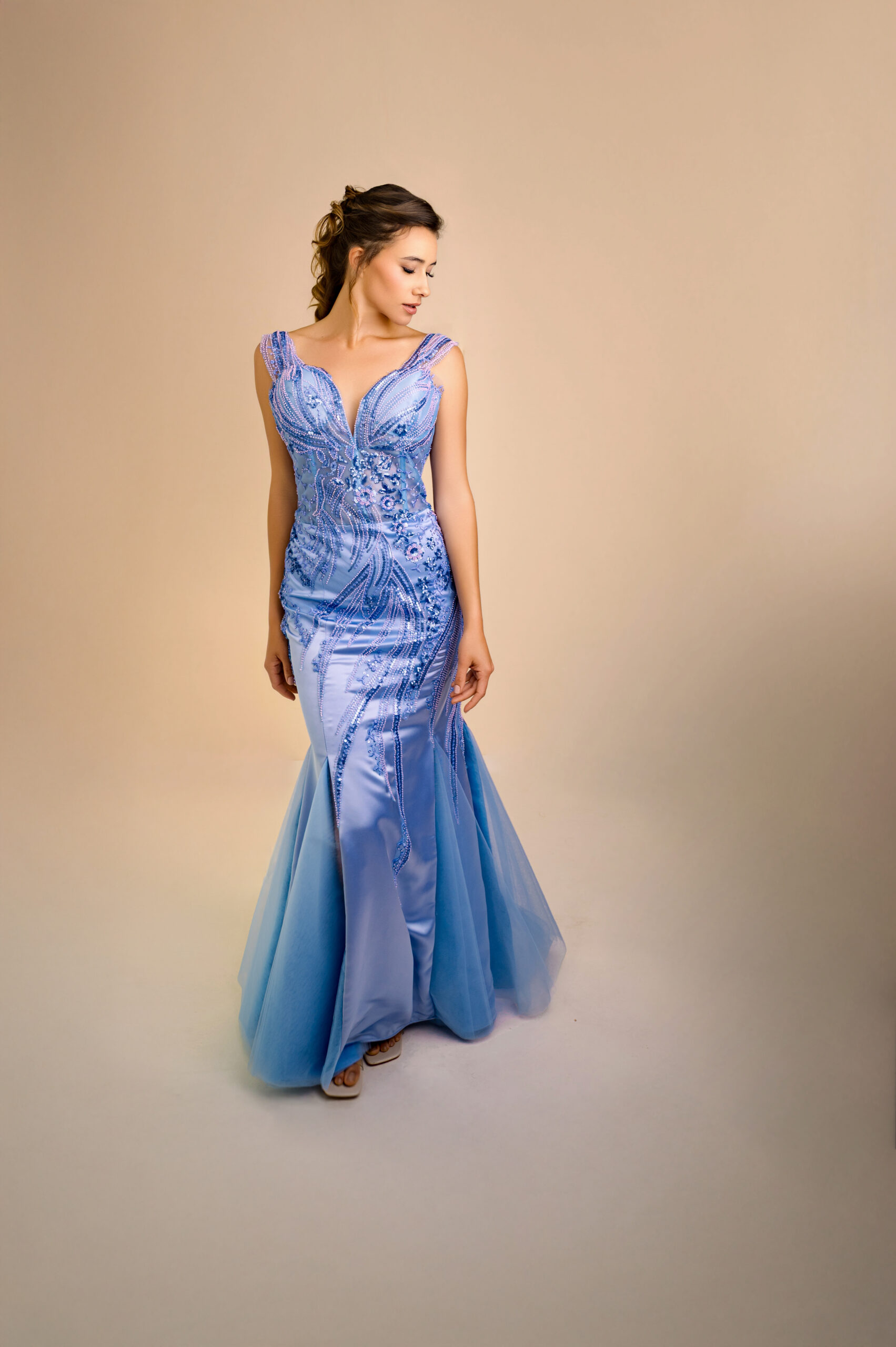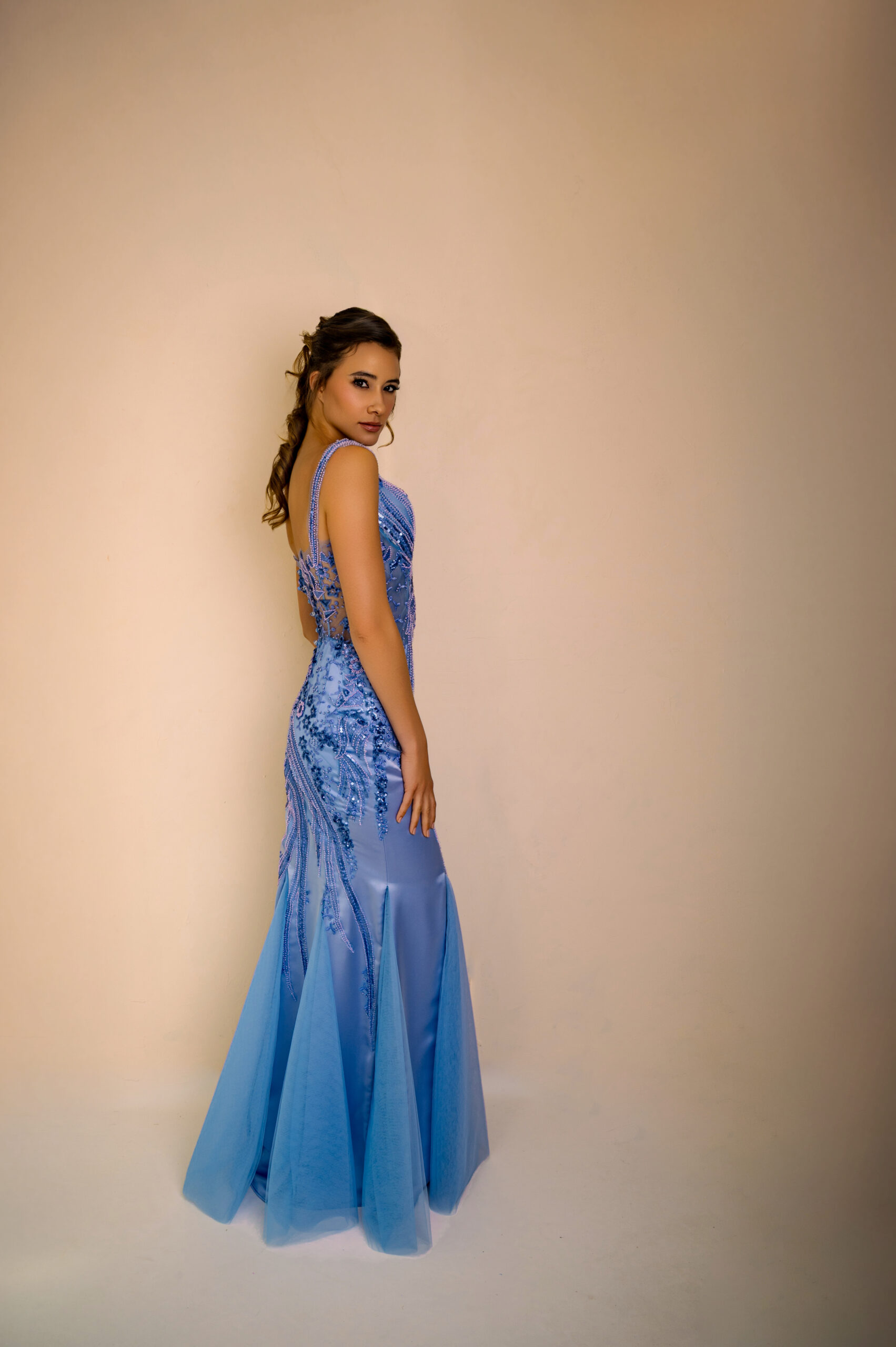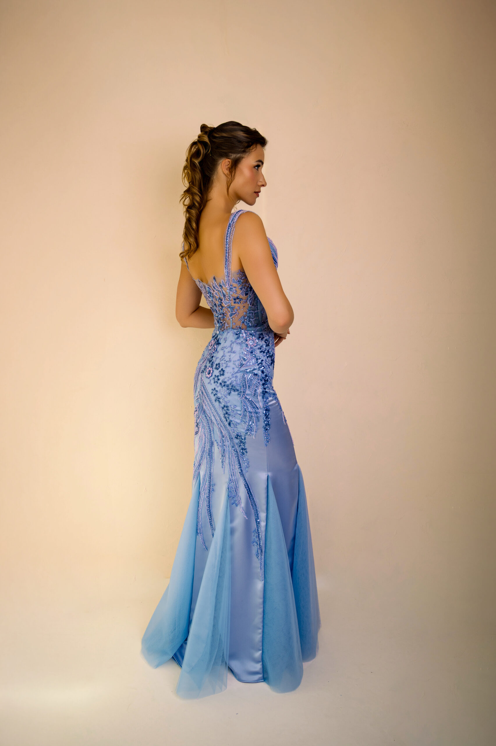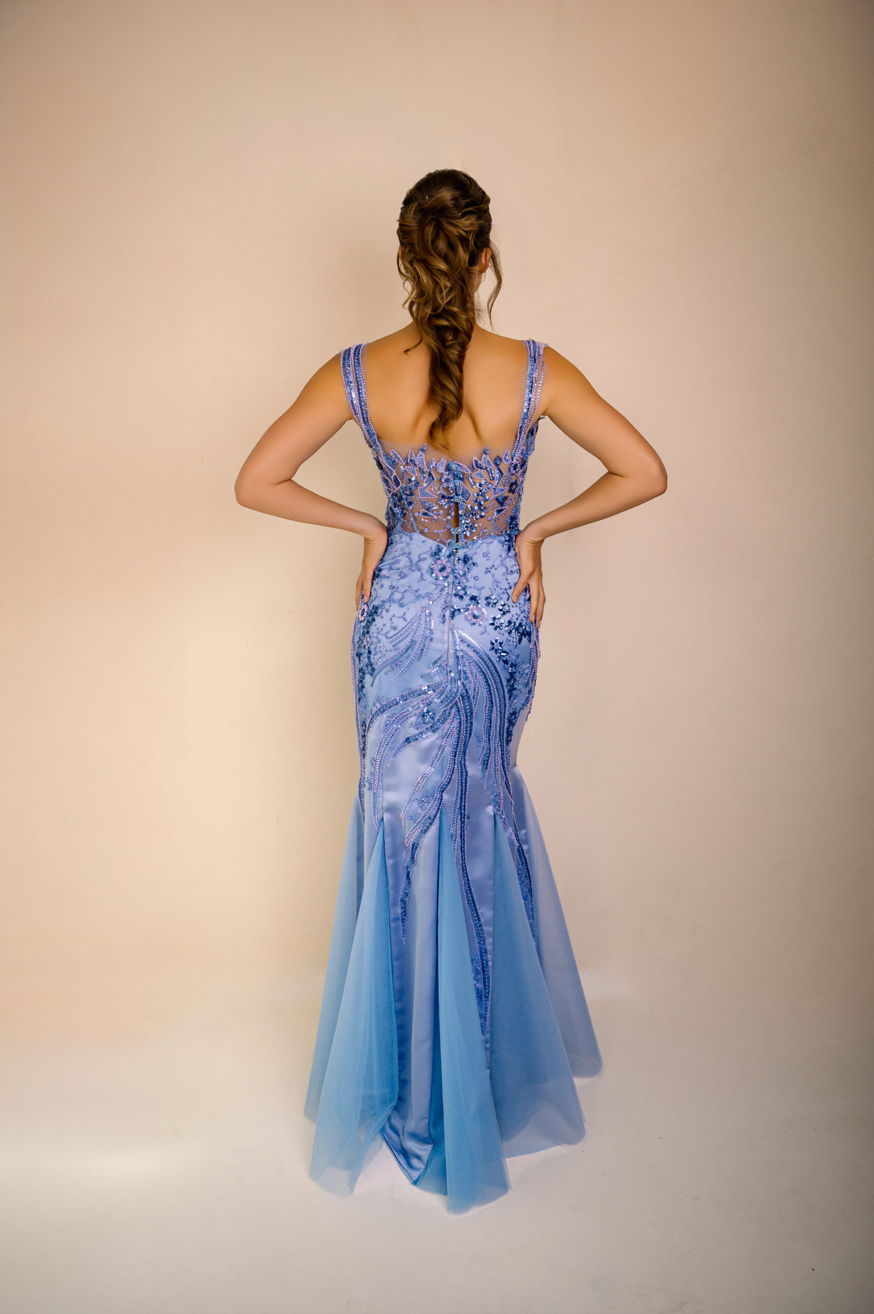 DETALLES: Modelo asignado con godets, corset escote corazón con tul de pedrería.