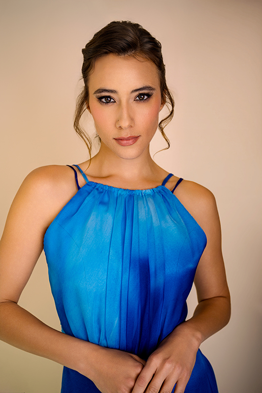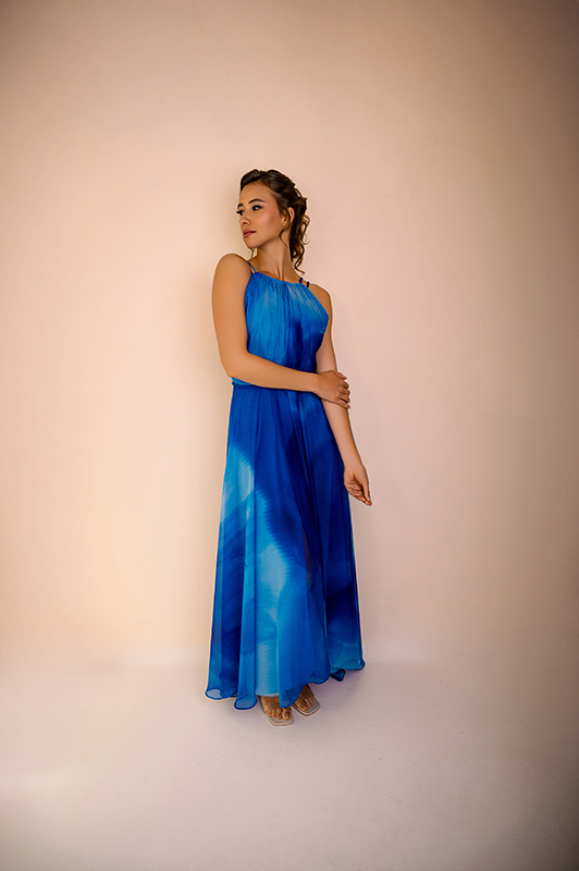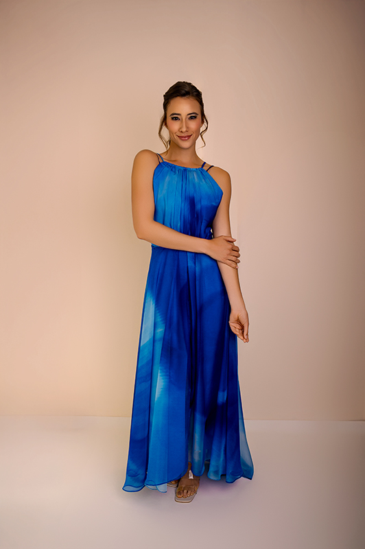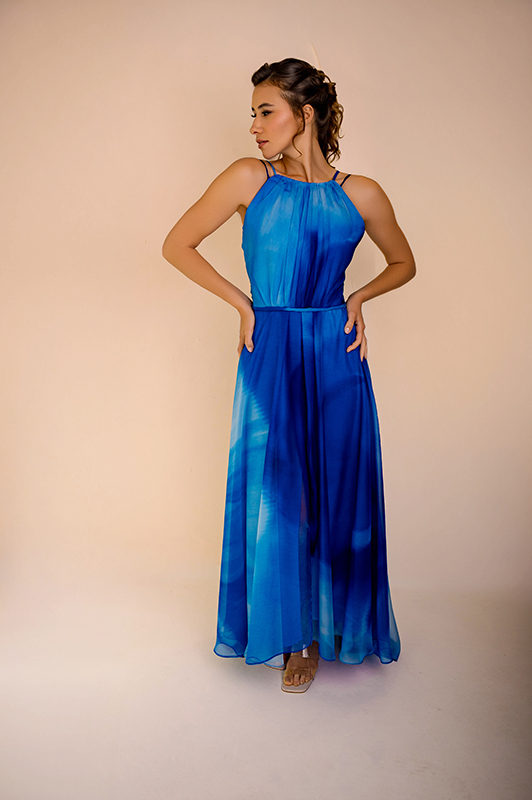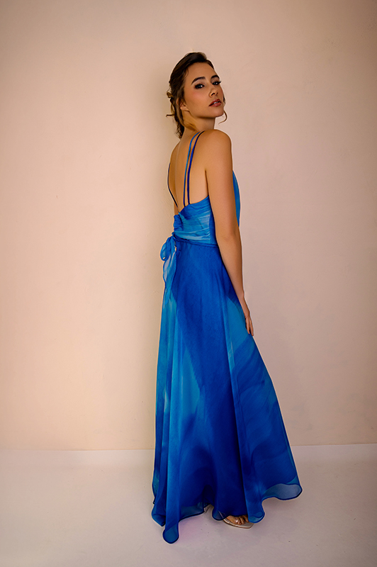 DETALLES: Caída sesgada, abertura delante y escote halter.