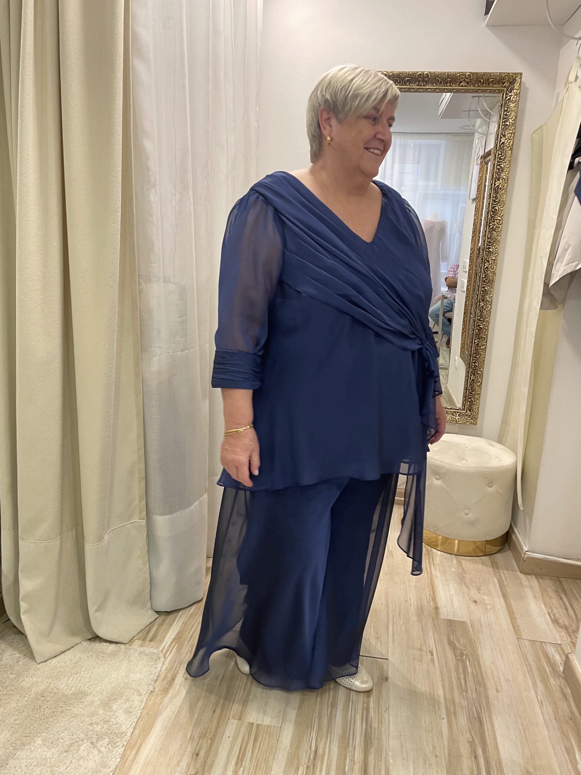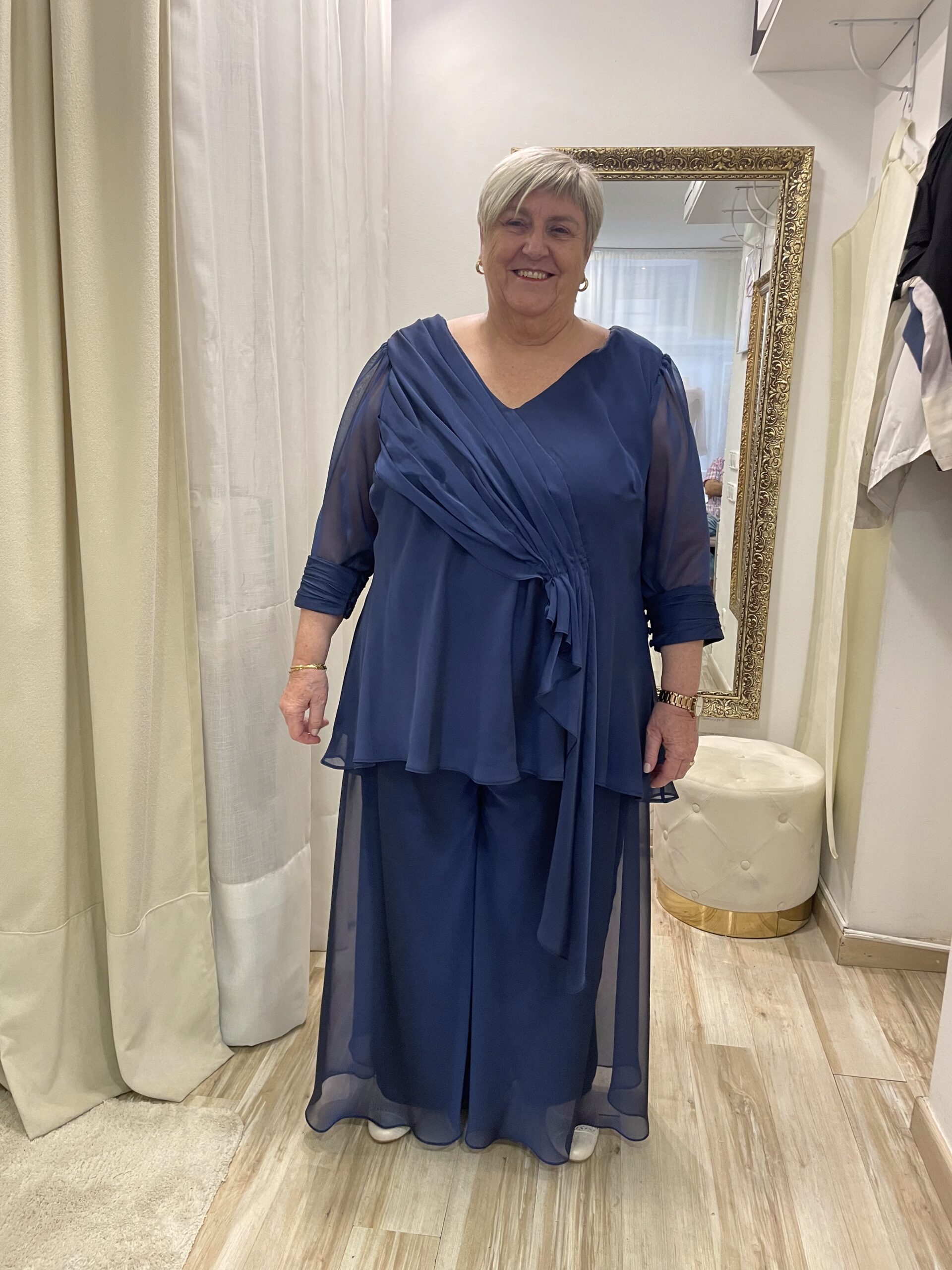 DETALLES: Modelo acampanado blusa con drapeado, puños drapeados y pantalón acampanado.